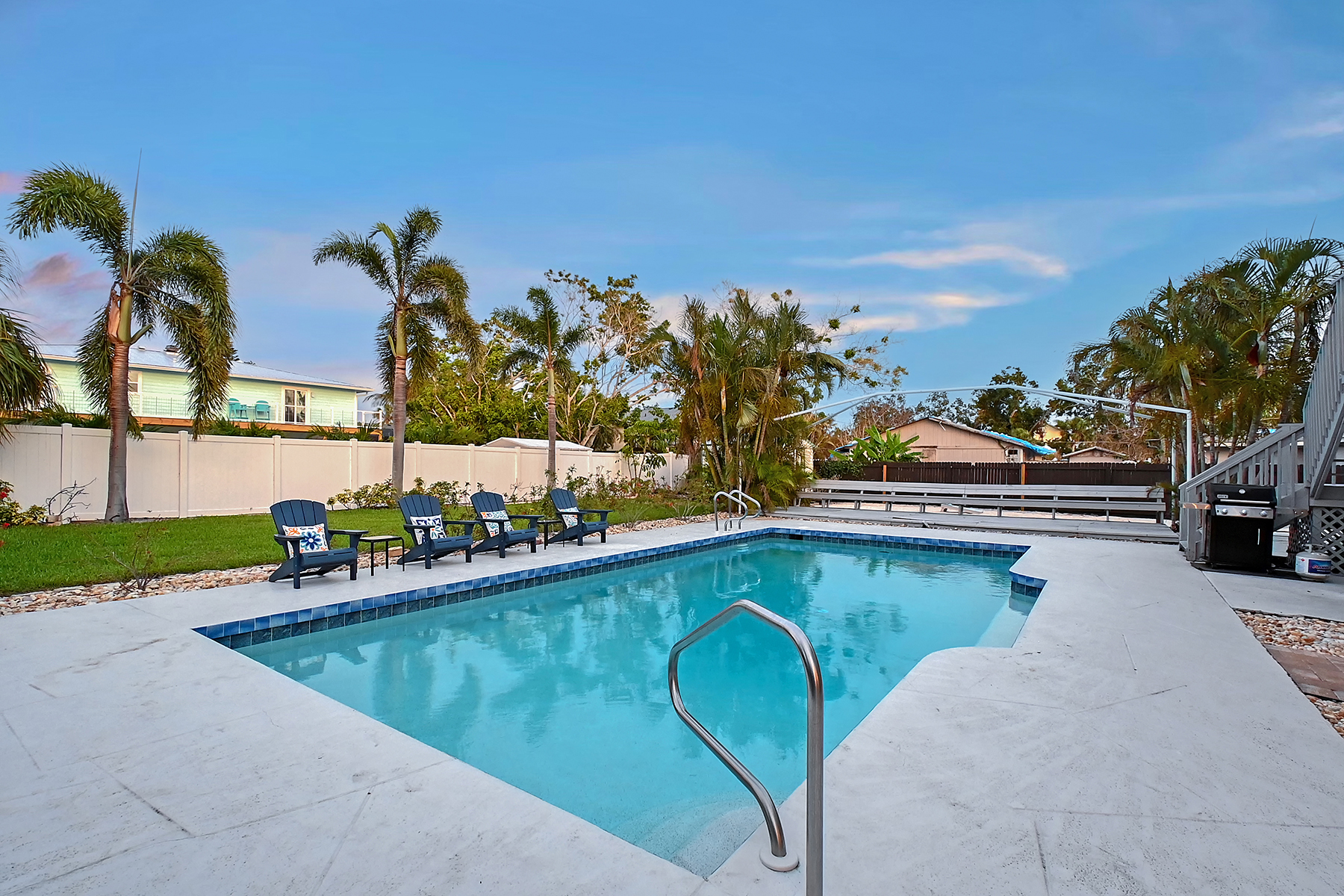 Dive into the refreshing pool, sip cocktails on the sun-drenched patio, or curl up in the cozy interiors. With comfortable sleeping arrangements for up to 7 guests, it’s ideal for families or groups seeking a memorable Florida retreat. Poolside, you’ll love the vibe — complete with lounge chairs, pool toys, a fire table, and an outdoor TV for the ultimate relaxation experience.